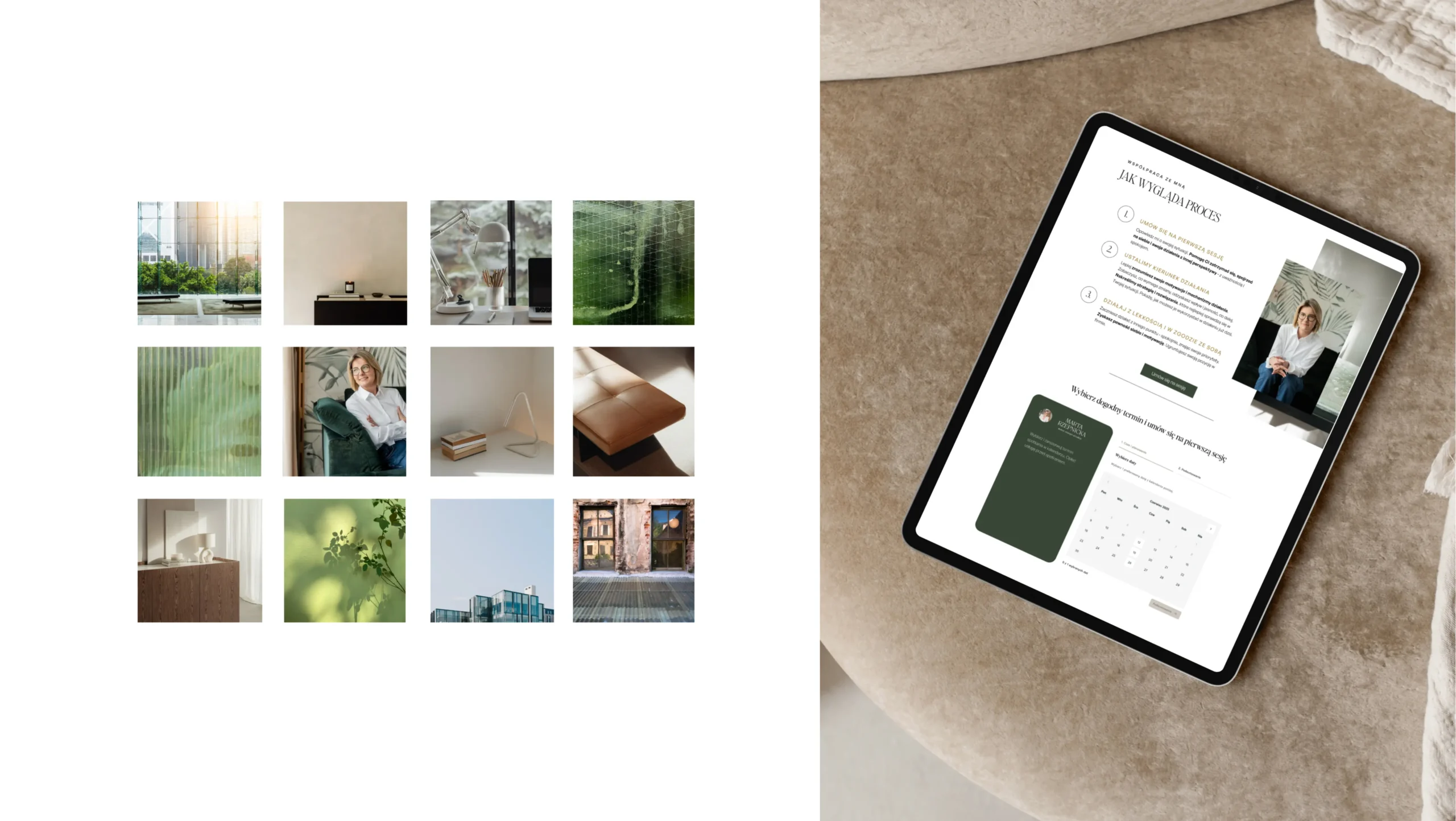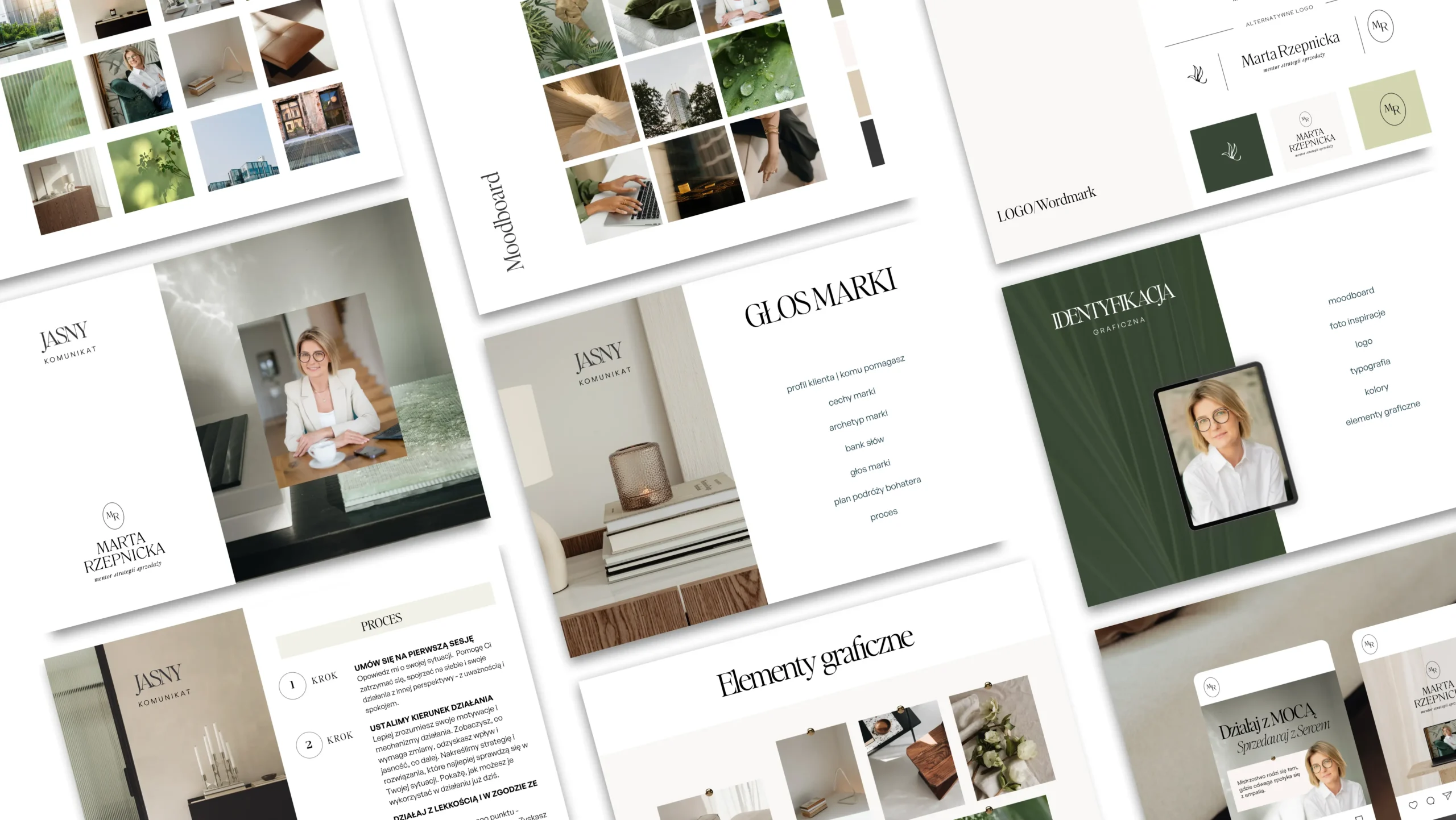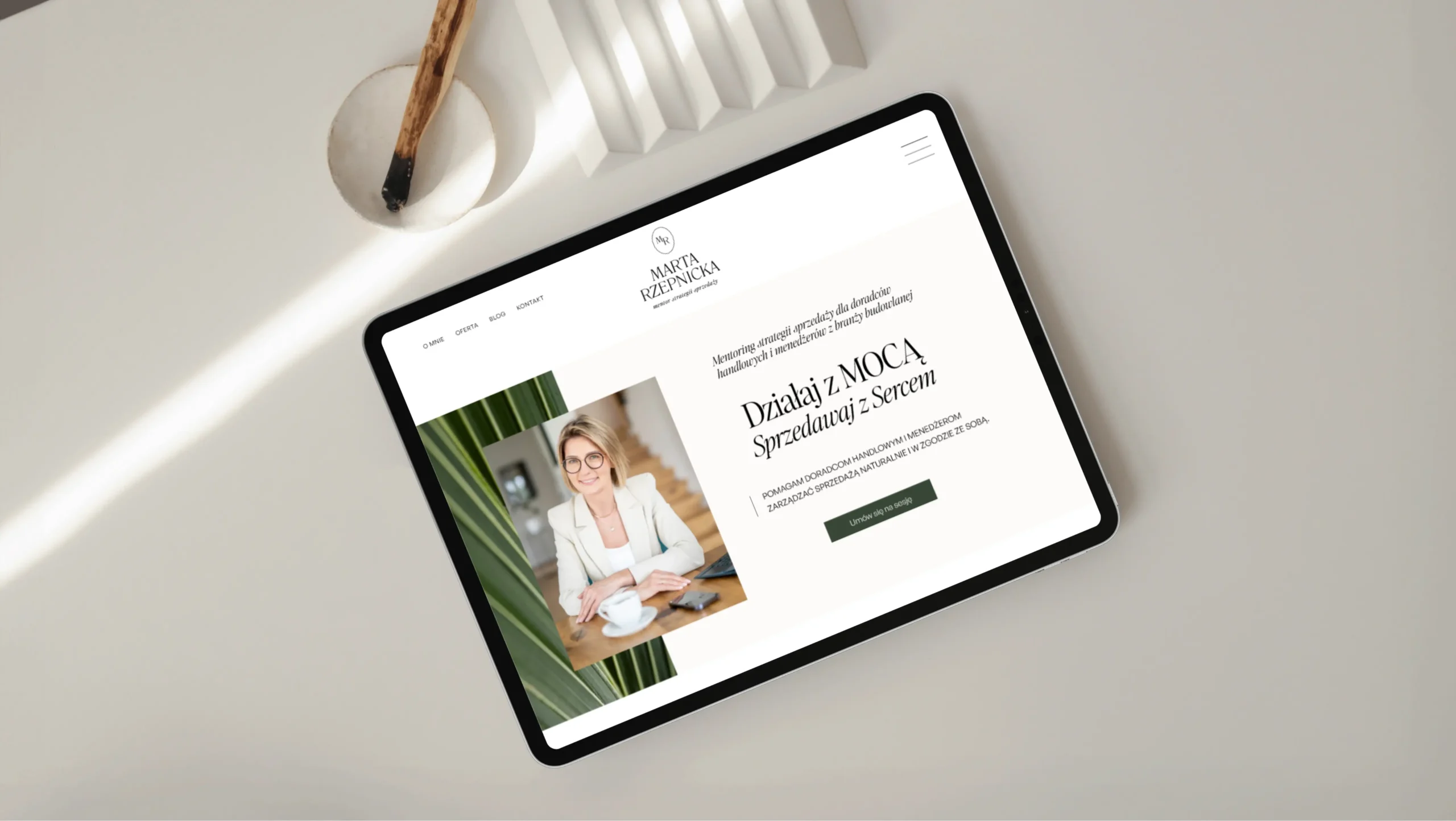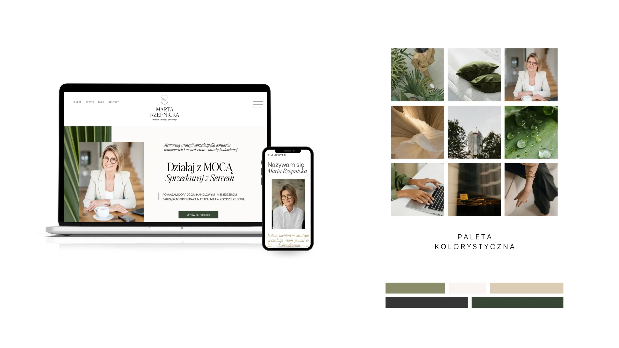 Marta potrzebowała zbudować markę od zera. Dlatego zaczęłyśmy od określenia fundamentów. Marta nie miała zbudowanego brandingu, potrzebowała zbudować profesjonalny wizerunek mentorki. Powstała oprawa wizualna w stylu klasycznym. W klimacie naturalnej zieleni w połączeniu z kolorem piaskowym i naturalnego drewna.