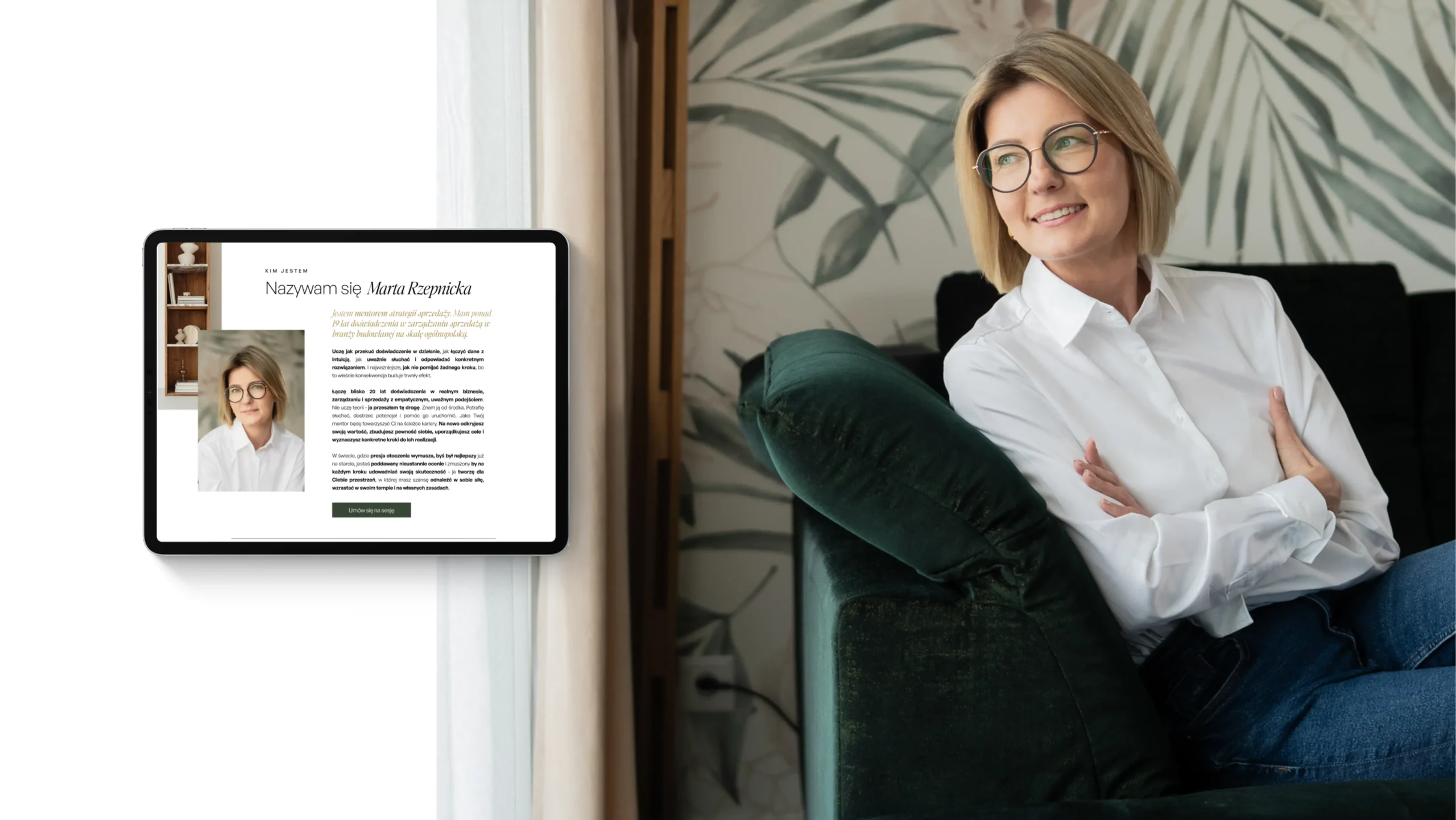 Istotnym elementem brandingu była sesja zdjęciowa wzmacniająca zarówno profesjonalny wizerunek biznesowy – garnitur, atrybuty mentora. Jak i ujęcia prezentujące Martę w nieco luźniejszej odsłonie – w jeansach, jasnej koszuli z filiżanką kawy.