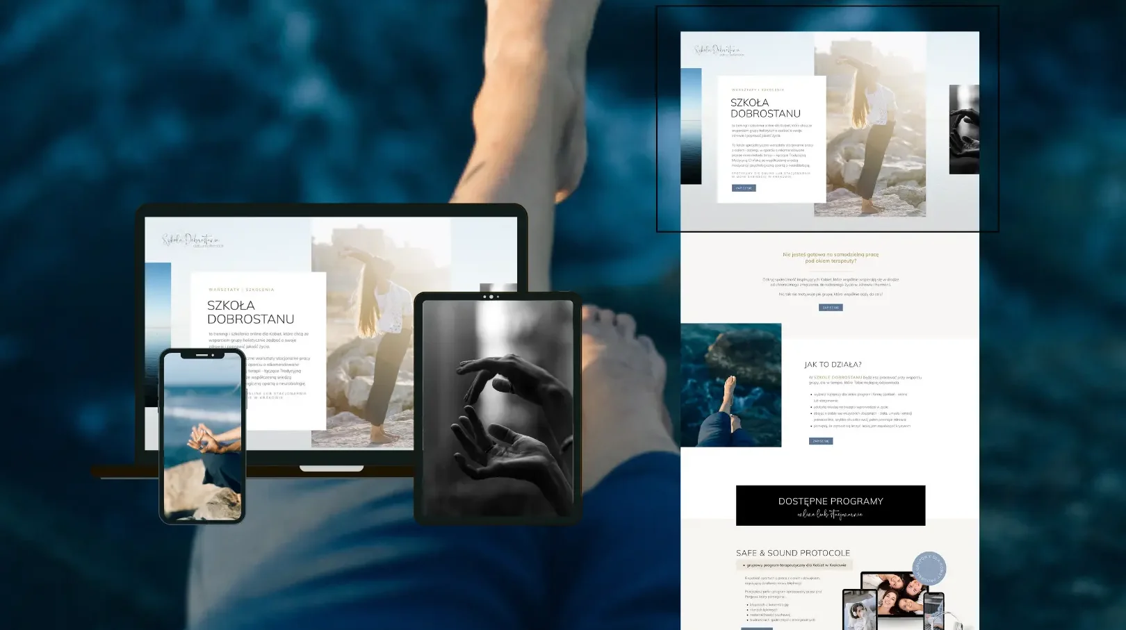 Następnie Eliza poprosiła nas o odrębny projekt identyfikacji wizualnej dla jej programu flagowego Szkoła Dobrostanu. Tym razem powstała identyfikacja wizualna w tonacji błękitu, piaskowego i czekolady. W tym klimacie zrealizowałyśmy projekt zakładki elizawajdi.pl/szkola-dobrostanu i pozostałych stron sprzedażowych z programami, które oferuje Eliza.